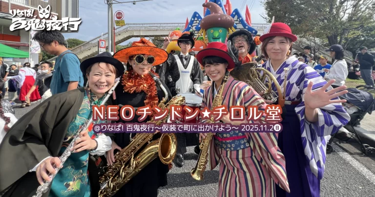 鹿児島県鹿屋市で開催された鹿屋市秋祭り歩行者天国とコラボ開催。ハロウィンではレアな“和風”の『りなぱ! 百鬼夜行~仮装で町に出かけよう~2025』にNEOチンドン☆チロル堂が仮装パレードの先導隊として生演奏出演して参りま … 続きを読む NEOチンドン☆チロル堂@りなぱ! 百鬼夜行~仮装で町に出かけよう~2025